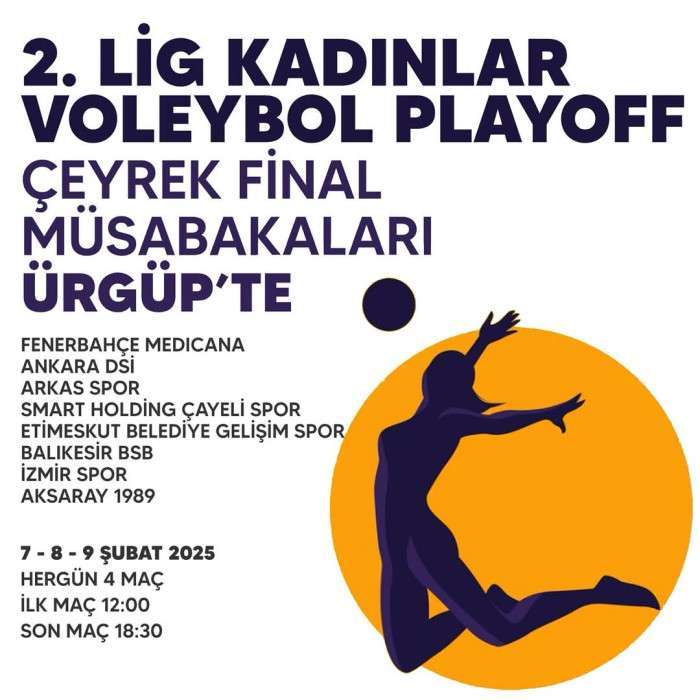 Türkiye Kadınlar Voleybol 2. Ligi’nde playoff heyecanı Ürgüp’te yaşanacak. Çeyrek final müsabakalarına ev sahipliği yapacak olan Ürgüp, voleybol severleri büyük bir mücadeleye tanıklık etmeye davet ediyor.