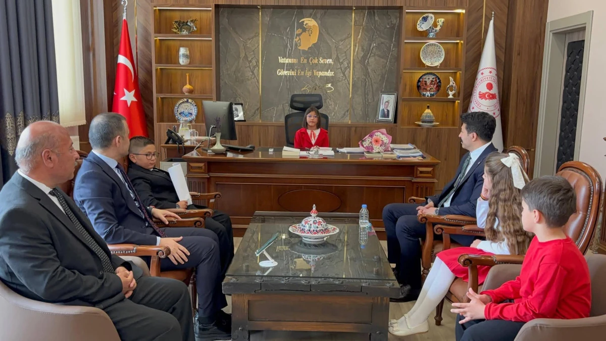 Kaymakamlık makamında gerçekleşen ziyarete İlçe Millî Eğitim Müdürü Salih Yıldız, Okul Müdürü Doğan Çeltik, öğrenciler ve velileri katıldı.
