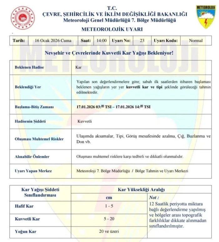 Meteoroloji Genel Müdürlüğü 7. Bölge Müdürlüğü tarafından yapılan son değerlendirmelere göre, Nevşehir ve çevrelerinde kuvvetli kar yağışı bekleniyor. Uyarıya göre yağışların 17 Ocak 2026 Cumartesi günü sabah saat 03.00’ten itibaren başlayacağı ve aynı gün saat 14.00’e kadar etkili olacağı tahmin ediliyor.