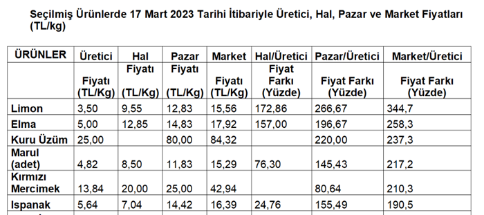 Markette limon 4,4 kat, elma 3,6 kat, kuru üzüm 3,4 kat, marul 3,2 kat, kırmızı mercimek 3,1 kat fazlaya satıldı. Üreticide 3 lira 50 kuruş olan limon 15 lira 56 kuruşa, 5 lira olan elma 17 lira 92 kuruşa, 25 lira olan kuru üzüm 84 lira 32 kuruşa, 4 lira 82 kuruş olan marul 15 lira 29 kuruşa, 13 lira 84 kuruş olan kırmızı mercimek 42 lira 94 kuruşa, 5 lira 64 kuruş olan ıspanak 16 lira 39 kuruşa satıldı.”