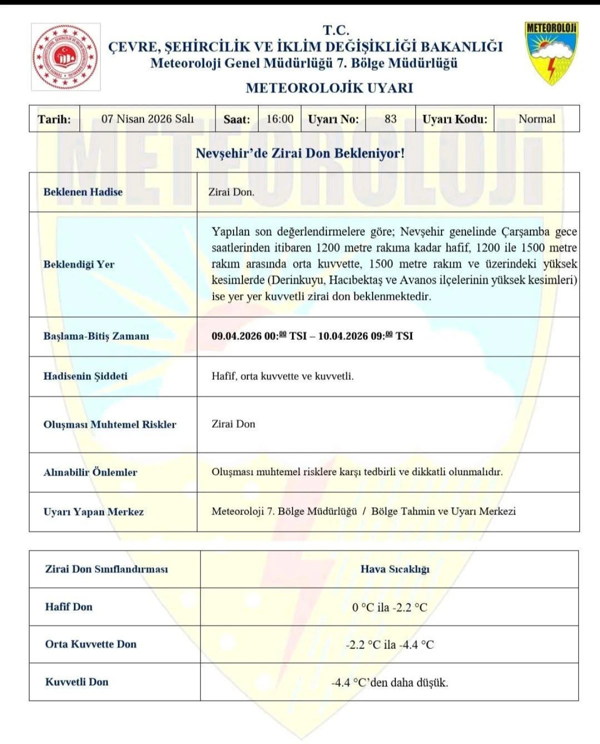 Zirai don olayının 9 Nisan 2026 tarihinde saat 00.00’da başlayacağı ve 10 Nisan 2026 tarihinde saat 09.00’a kadar etkisini sürdüreceği belirtildi.